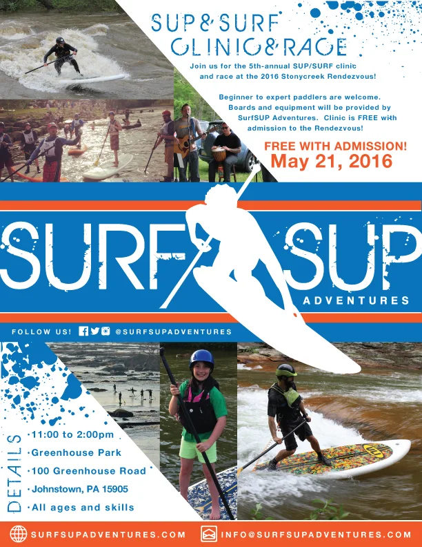 The 2016 Stonycreek Rendezvous is coming soon (May 20 - 22nd)! This is Pennsylvania's premiere adventure and whitewater festival with fun for everyone. SurfSUP will be hosting a FREE river surfing and standup paddleboarding demo on Saturday, May 21rst. Come enjoy the fun!!