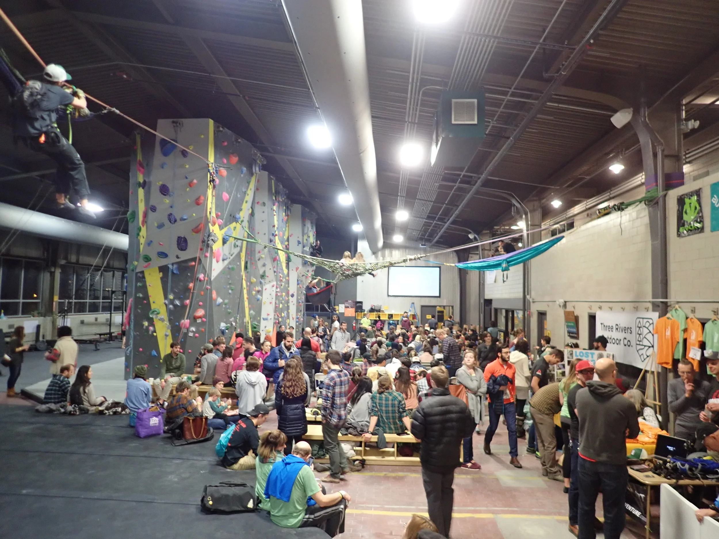 Thanks to the brainchild of local marketing firm, Cultivate, and the burgeoning outdoor retailer, 3-Rivers Outdoor Company, 5point made its first ever screening in Pittsburgh. The festival took place at Ascend – Pittsburgh’s newest rock climbing gym in South Side. With free climbing included with the ticket, beer provided by East End Brewing, and amazing raffle prizes from vendors and sponsors – the festival had something for everyone. Several people even slung hammocks and webbed viewing platforms 20 – feet above the ground for additional seating.